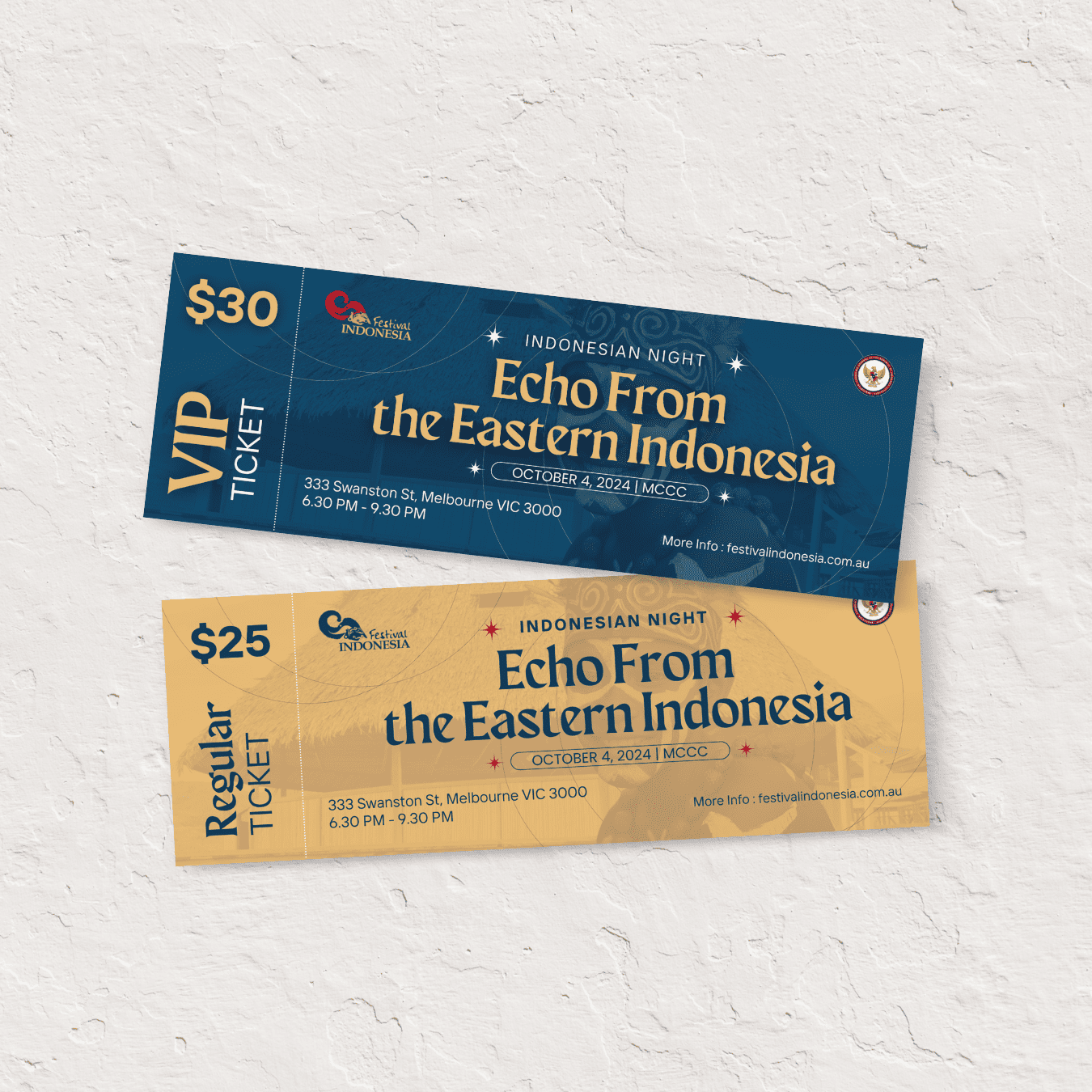 A central element in the visual identity was a custom super graphic inspired by traditional Eastern Indonesian art. The design drew from the bold, geometric patterns of Papuan shields crafted by the Asmat tribe, blended with the organic, flowing motifs of tree bark paintings by the Asei people of Lake Sentani. Digitally reinterpreted, this visual fusion became a cultural anchor—supporting the festival’s theme while adding texture, rhythm, and a touch of vector geekery to everything from stage backdrops to social media posts.